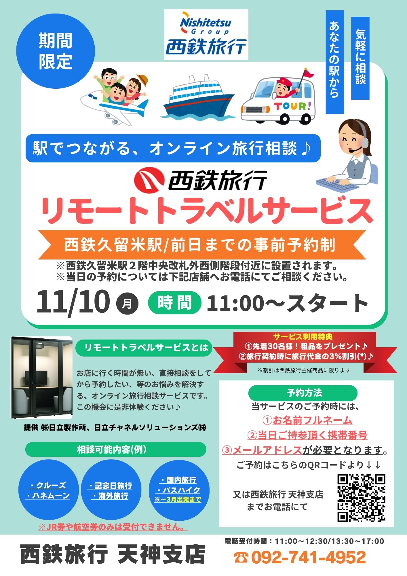 お知らせ【福岡】11月10日(月)より「リモートトラベルサービス」を開始いたします 西鉄久留米駅に設置!事前予約制となります。詳細・予約はこちらからご確認ください。