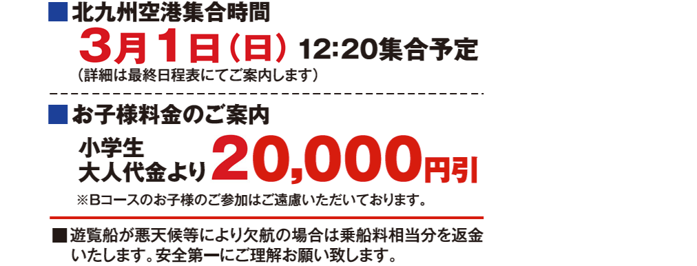 - A お申込みの人数が最少催行人員に達し次第、ご予約いただいているお客様に催行確定のご連絡をいたします。