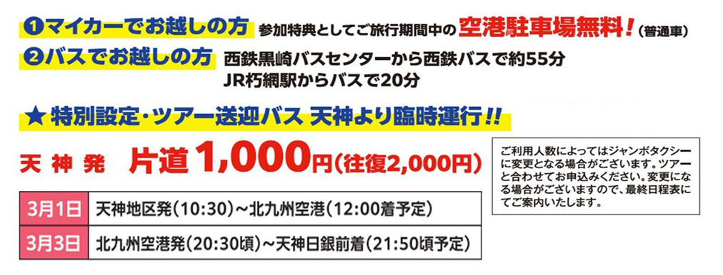 日付 ルート 行き3/1 天神地区(10:30発)=北九州空港(12:00頃着予定) 帰り3/3 北九州空港(20:30頃)=天神日本銀行前(21:50頃着予定)