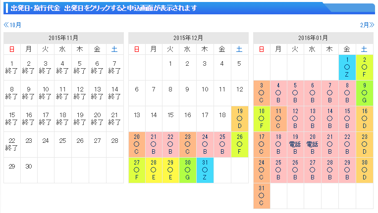 ツアー内容を、左記の『ツアー詳細』画面よりご覧いただき、商品内容をご確認ください。ご希望の出発日程の、カレンダーの日付をクリックするとお申し込みの入力フォームが、新しいウィンドウで開きます。