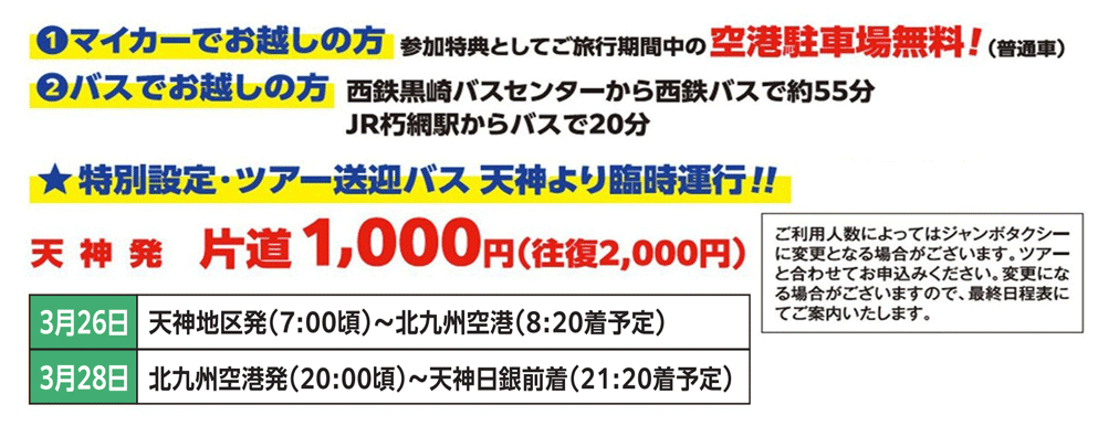日付 ルート 行き3/26 天神地区(7:00発)=北九州空港(8:20頃着予定) 帰り3/28 北九州空港(20:00頃)=天神日本銀行前(21:20頃着予定)